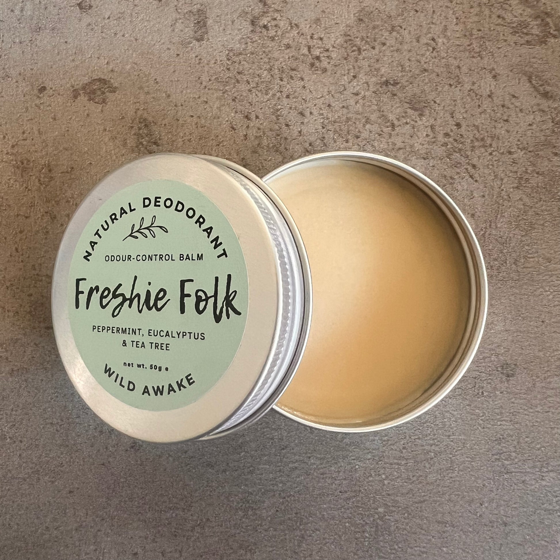 Shea Butter, Arrowroot powder, Kaolin Clay, Sodium Bicarbonate, Coconut Oil, Sunflower Oil (cold pressed, high oleic), Beeswax, Vitamin E Oil, Pure Essential Oil Blend (Peppermint, Eucalyptus and Tea Tree)